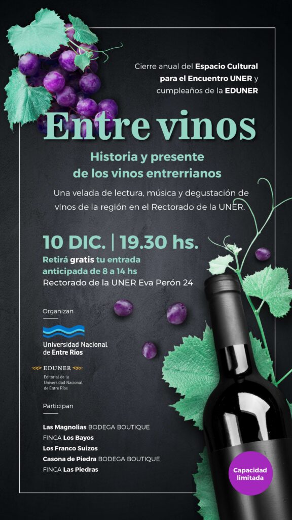 Finaliza un año de importantes eventos con “Entre Vinos: historia y presente de los vinos entrerrianos”, que propone un momento de lectura, degustación de vinos de la región y música. También se celebra el aniversario de EDUNER.