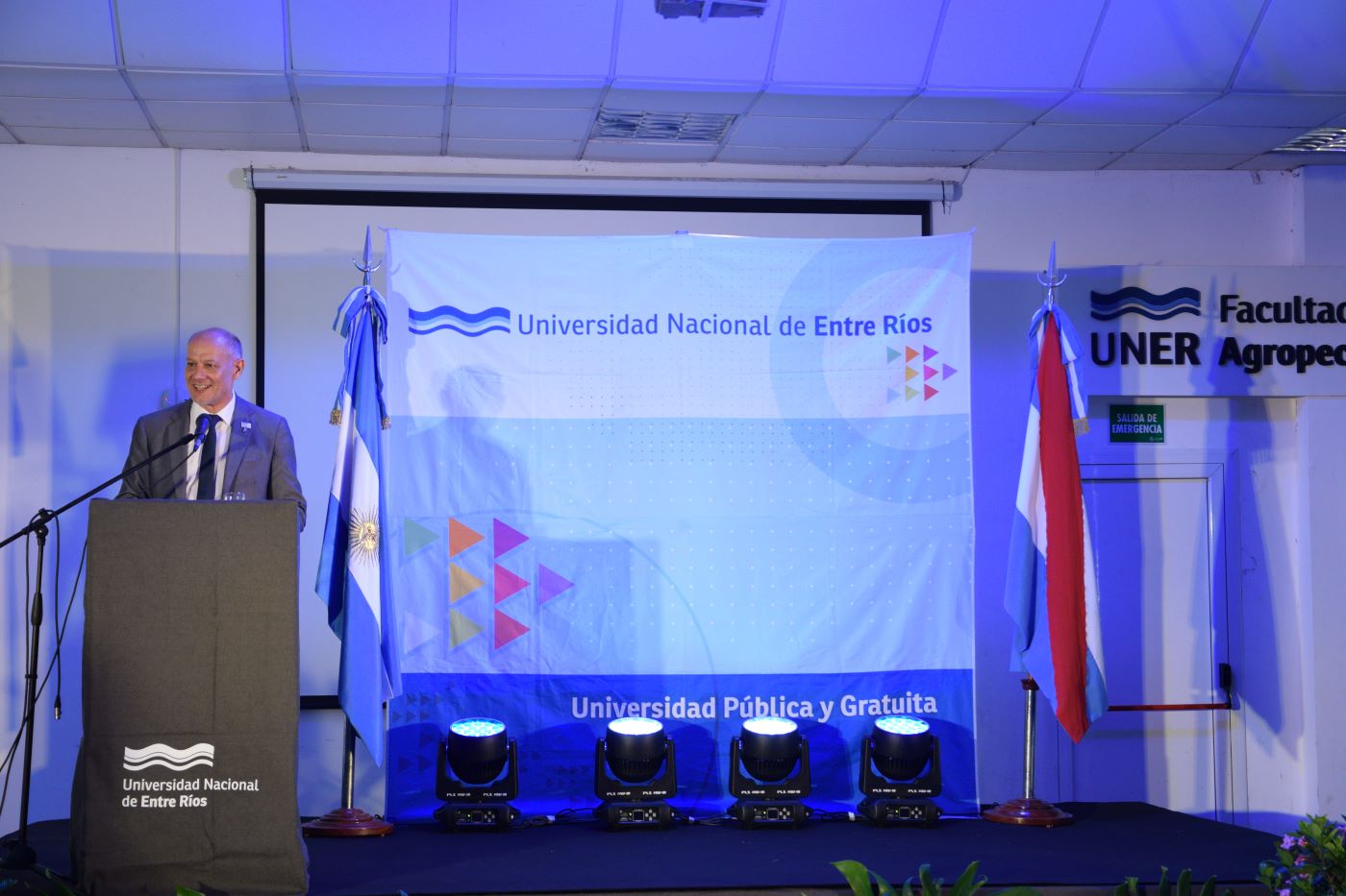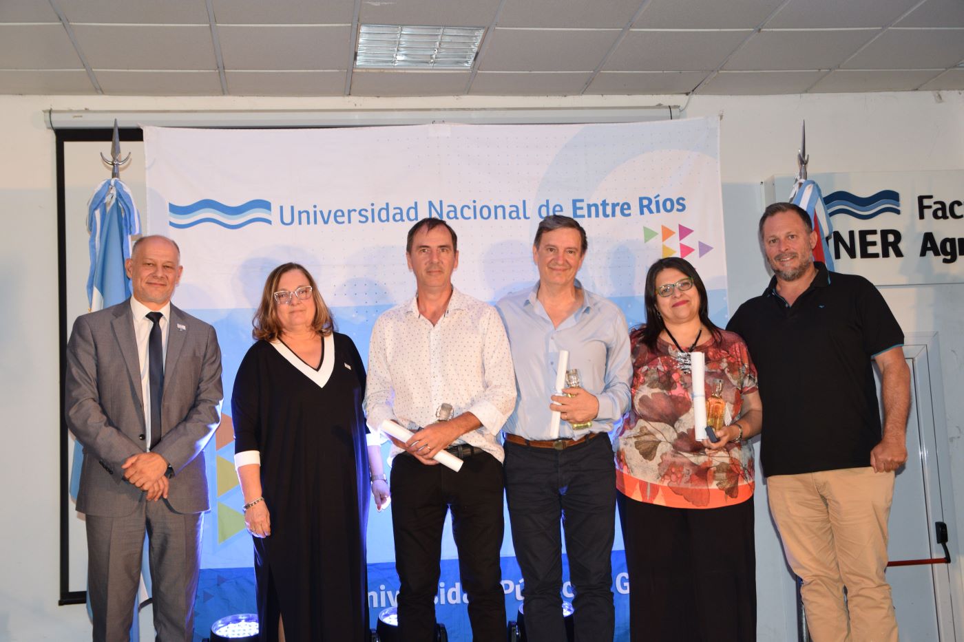 En el salón de la Facultad de Ciencias Agropecuarias en Oro Verde, se realizó el Acto de reconocimiento por los 25 años de servicio de docentes y no docentes de la Universidad Nacional de Entre Ríos, presidido por el Rector Andrés Sabella, quien estuvo acompañado de la Vicerrectora Gabriela Andretich, Decanos, Decanas y Vicedecanas de las unidades académicas. También contó con la presencia de otras autoridades, miembros de la comunidad universitaria y familiares de los agasajados.