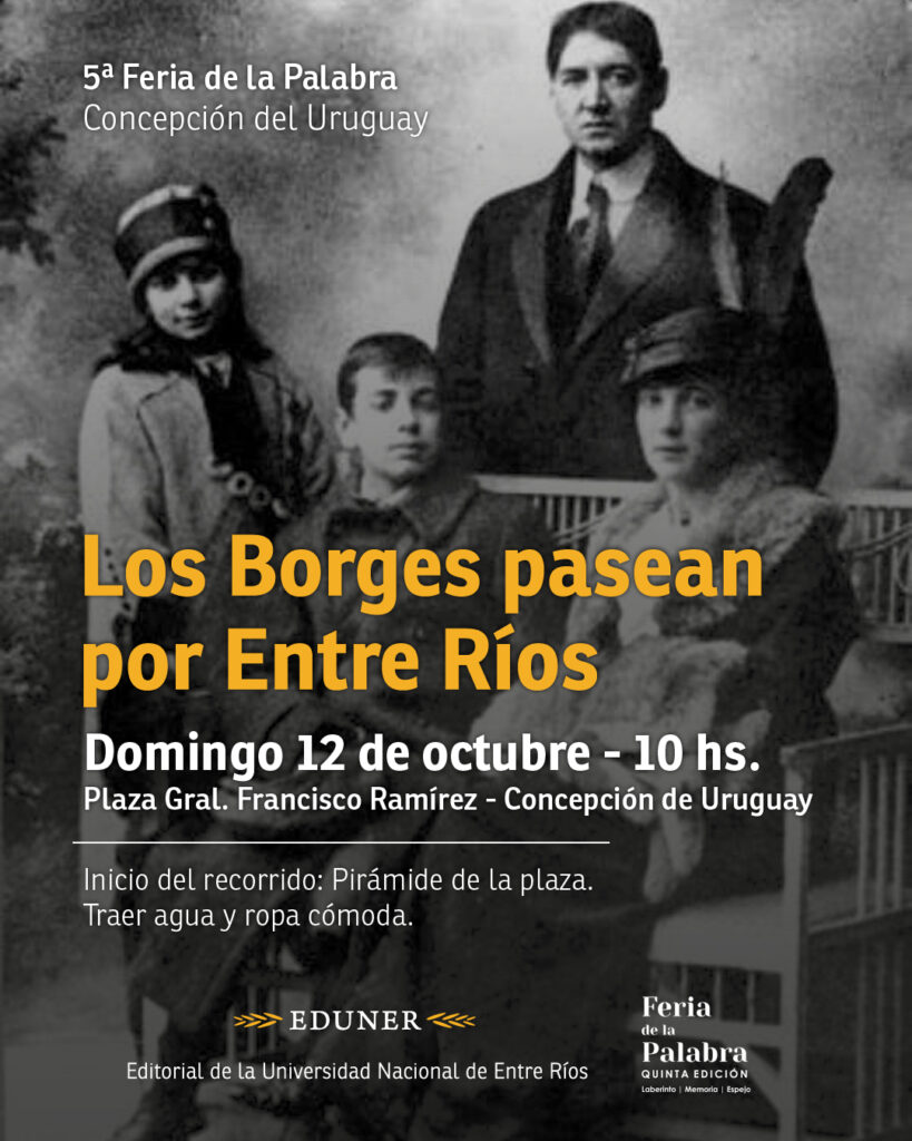 El domingo 12 de octubre a las 10:00 hs la EDUNER propondrá una caminata con lecturas de Jorge Luis Borges, de Jorge Guillermo Borges (su padre, nacido en Entre Ríos en 1874), de sus conferencias en Villaguay, Paraná, Concordia y Concepción del Uruguay. Asimismo, se reconstruirán las historias de sus antepasados, que habitaron Uruguay y Entre Ríos y la historia de su amistad con Carlos Mastronardi (quien fuera alumno del Colegio Nacional).