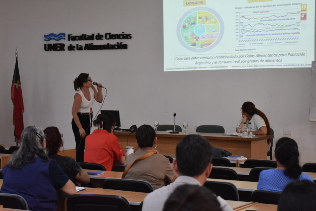 La licenciada en Nutrición Laura Lonardi, docente y extensionista de la Facultad de Bromatología, estuvo a cargo de algunos de los talleres de la jornada. Junto a la docente Agustina de la Fuente y la estudiante Alejandra García desarrollaron una actividad donde participaron estudiantes de primer año de la carrera en Ingeniería en Alimentos, orientado a reflexionar sobre qué acciones se pueden realizar como comunidad universitaria para promover una alimentación justa, saludable y sustentable.