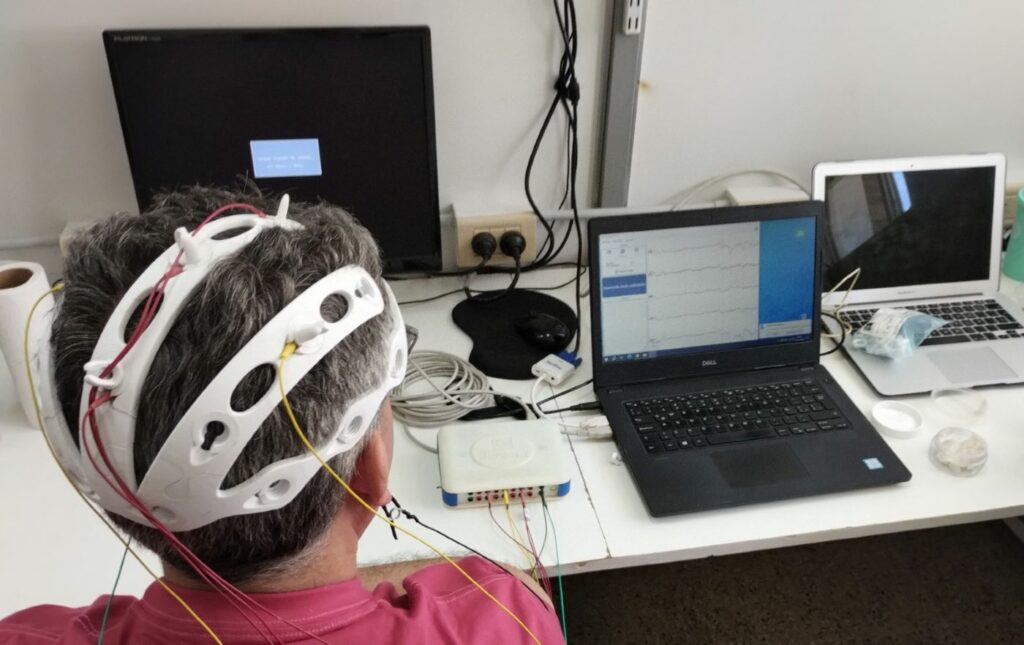Estos últimos años, el GIR estuvo enfocado en el desarrollo y aplicaciones de las interfaces cerebro-computadoras para rehabilitación neurológica. Al respecto, la Doctora en Ingeniería explicó: “Una interfaz cerebro-computadora es un sistema que funciona a lazo cerrado. Si está basada en la señal de electroencefalografía, la registra a través de la colocación de pequeños electrodos sobre el cuero cabelludo. Luego, registra la actividad cerebral del usuario cuando intenta realizar un movimiento, concentrarse, imaginarse o recrearse”.